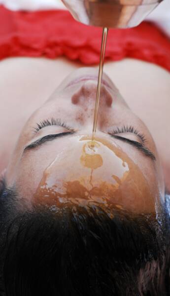 Shirodhara is truly an amazing Ayurvedic therapy that can work wonders on disorders caused by Vata aggrevation. Nervousness, anxiety, depression, insomnia & overstimulation, just to name a few, are all reduced with shirodhara. “Shiro” means “head” & “dhara” means “stream.” In shirodhara, a warm oil stream is continuously poured over the “sthapani marma” (the space between and above the eyebrows) otherwise known as “the third eye,” as it has a soothing effect on the hypothalamus. Shirodhara is thought to sync frenetic neurons & alpha waves to greatly improve mental clarity, create stability & impart calm.
